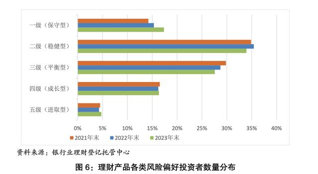 2023年,个人客户的风险承受能力也发生了变化。其中,风险偏好为一级(保守型)的客户占比增加了2.02个百分点。但持有理财产品的个人投资者中数量最多的仍是风 险偏好为二级(稳健型)的投资者,占比 33.95%。