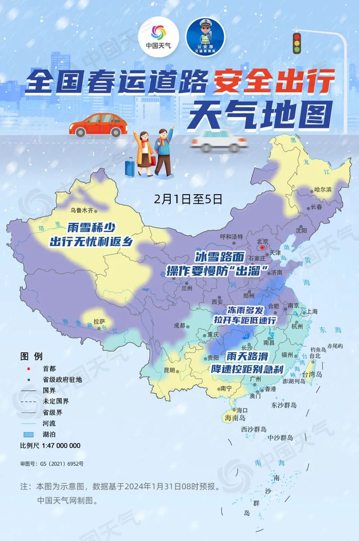 春运期间自驾返乡、探亲、旅游出行的人员激增,本轮大范围雨雪天气过程正值春节前返乡出行高峰期,对春运影响较重,大家返乡时务必要注意行车安全。