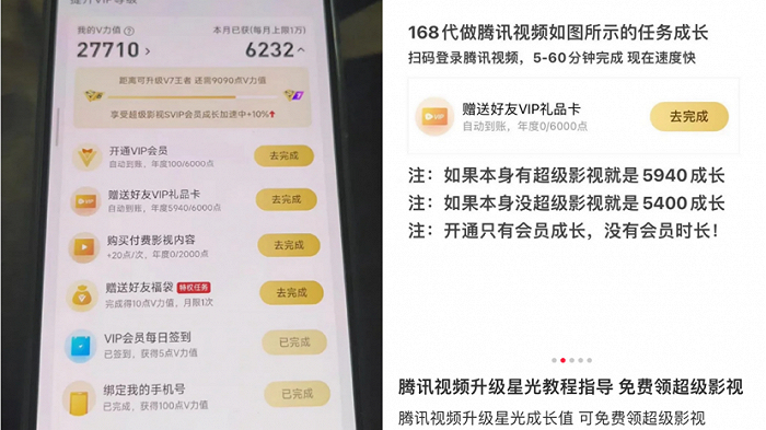 这种高级会员的权益加持也催生出社交平台上不少“升级攻略”,甚至有黄牛出售“代做成长值”任务,主要是依靠“赠送好友VIP礼品卡”,每月可以增长6000点,福利已经明显变成了一种羊毛党的猎物。