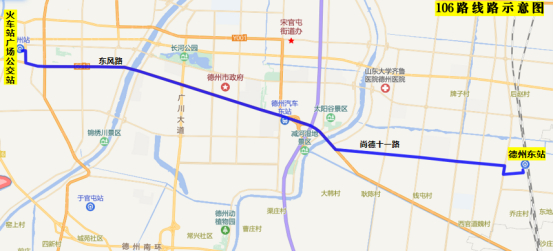 线路走向:火车站广场公交站、迎宾大街、东风路、尚德十一路、崇德十大道、德州东站,返程亦同。