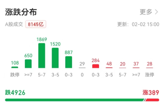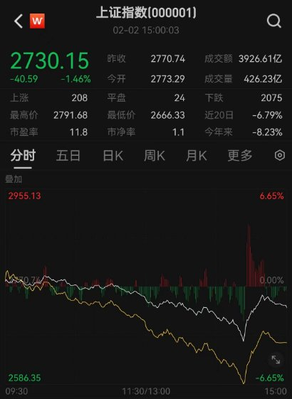 2月2日,隔夜美股大涨之际,A股再度大幅下探,沪指盘中一度重挫逾3%失守2700点关口,最终收跌1.46%至2730.15点。全市场下跌个股逾4900只,上百只个股跌停。