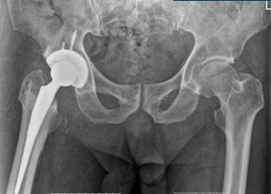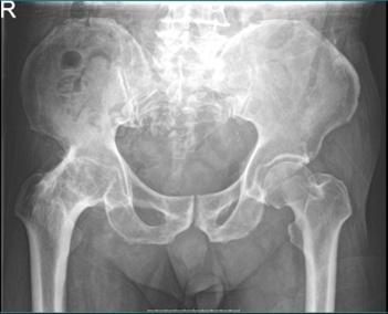 术前X光可见右髋关节骨性融合