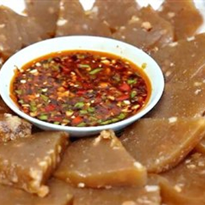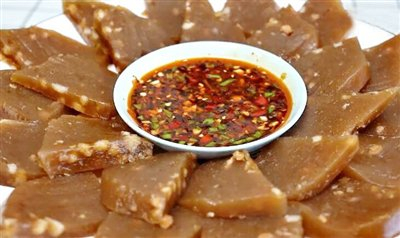 刚蒸好的焖子可以切成片直接吃。奶奶把焖子放在案板上,切下薄薄的几片,蘸一点用香油蒜汁,咬一口,真是软糯筋道,香味从口腔直沁入五脏六腑,有点像肉皮冻,但是比肉皮冻少了一些油腻,多了一丝清爽。