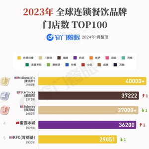 同时,喜茶、霸王茶姬、奈雪的茶、茉酸奶等品牌新入榜2023年全球连锁餐饮品牌门店数TOP100,全球门店数分别为超过3200家、3189家、1620家、1609家。