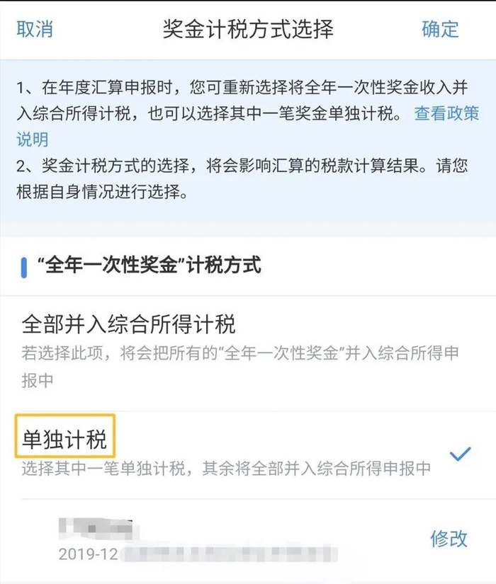选择【单独计税】,根据实际情况选择其中一笔单独计税,再点击【确定】,则该笔单独计税的奖金不纳入年度汇算的综合所得中。