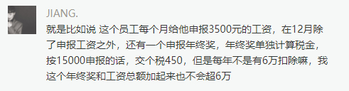 比如,这个朋友继续问的这个问题,如果我不是12月发年终奖,而是年初发的,年初发的时候我并不知道这个员工以后月份的工资收入,我如果先按照年终奖政策申报了,但是后面发现这个人全年综合所得都不高,白交了税了怎么办?