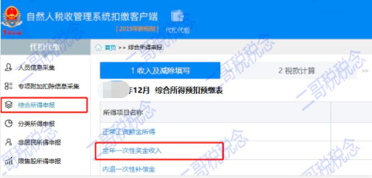 第一步、登录自然人税收管理系统,在综合所得申报下面有一个全年一次性奖金收入,点击进入