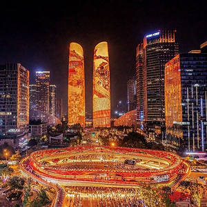 春熙路太古里片区是成都最时尚、最繁华、最具蜀都味的商圈之一,景观光彩遵循片区人文、时尚、商业等特色,结合“百年金街-春熙路”“震旦第一丛林”大慈寺以及水井坊、“交子”等历史遗存特点,整体景观照明以暖黄色泛光照明和商业内透照明为主,以商圈裸眼3D屏作为辅映,展现光影璀璨的高品质夜间消费场景。