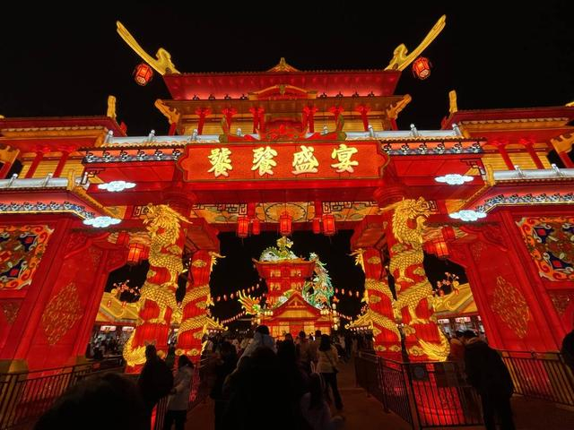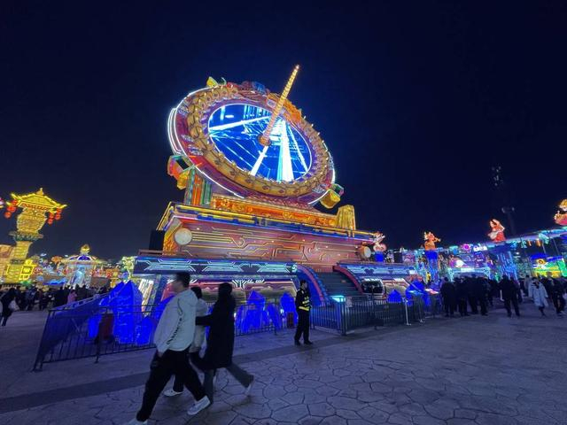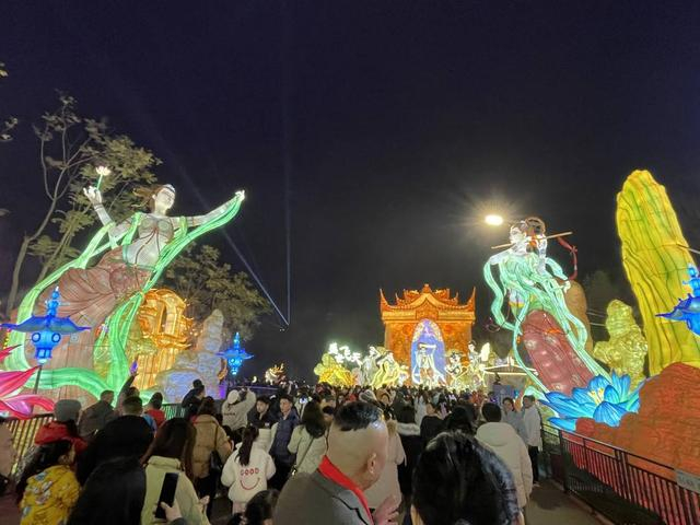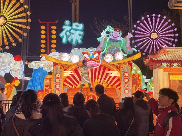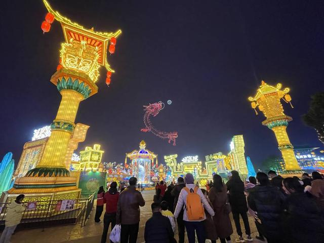 据悉,本届灯会在波澜壮阔的中华五千年文化长河中撷取素材,通过半年的创意策划,60天匠心制造,以时间为主轴,传统与现代交相辉映,融入“王者荣耀”“泡泡玛特”等顶流IP,精心打造“华夏乐章、盛世欢歌、年味中国、浪漫中国”四大板块,尽力为各方宾朋奉献一场流光溢彩、喜气洋洋的视觉盛宴。开幕式后,各方嘉宾兴致盎然地在园内观灯,零距离感受流光溢彩的彩灯盛宴。