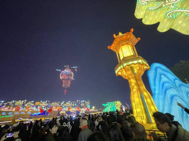 随着灯会亮灯,由2024架无人机组成的巨龙腾空而起,不断变换出龙凤呈祥、盐都景象、自贡恐龙等图案,宛如夜空中的星河,与现场灯光交相辉映,共迎八方宾客,园中的游客纷纷拿出相机、手机,对着空中的巨龙拍个不停。