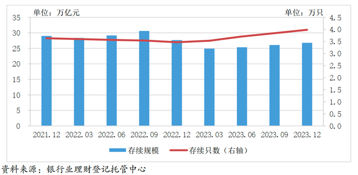 2023年是银行理财的“修复之年”。报告显示,截至2023年底, 全国共有 258 家银行机构和 31 家理财公司有存续的理财产品,共存续产品3.98 万只,较年初增加 14.86%;存续规模26.80 万亿元。