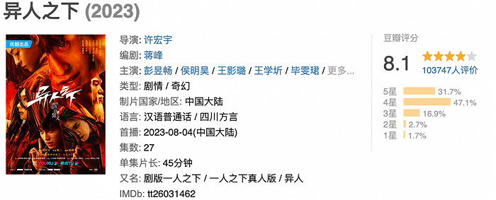 漫改作品和男频小说面对的困境相对类似,首先是受众较为狭窄,比如《异人之下》的原著《一人之下》已经是国漫中顶流IP了,成功改编成口碑不俗的剧集之后,也还是属于“小众高分剧”。