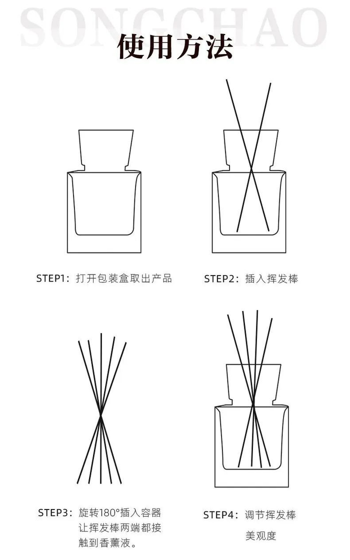 (无火香薰液体通过藤条吸附散发香味,翻转是为了加速藤条吸收,小贴士:1-3根藤条香味清淡,4-5根香味适中,6-8根香味浓郁。)
