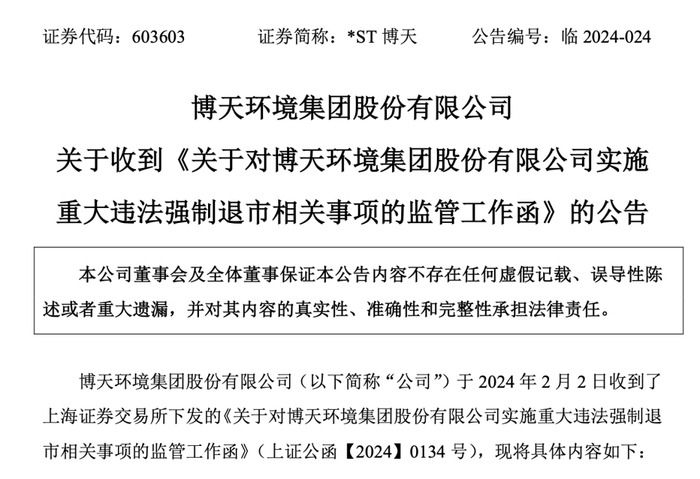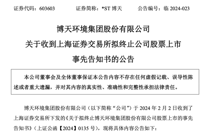 2月2日晚间,博天环境集团股份有限公司(以下下称:博天环境或*ST博天)发布公告称,因连续5年财务造假,上交所已向公司下发《关于拟终止博天环境集团股份有限公司股票上市的事先告知书》(下称“告知书”),决定对公司股票作出终止上市决定。