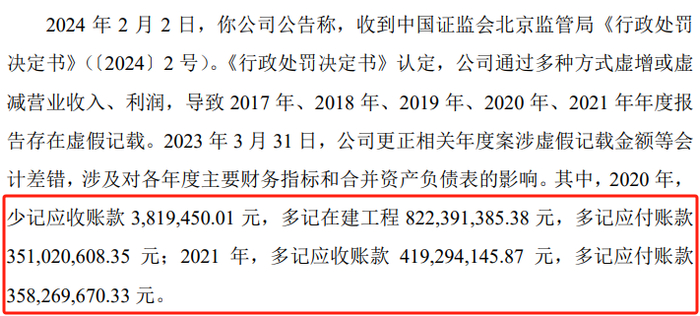 其中,2020年,少记应收账款381.94万元,多记在建工程8.22亿元,多记应付账款3.51亿元;2021年,多记应收账款4.19亿元,多记应付账款3.58亿元。