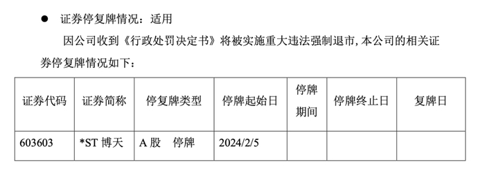 *ST博天将在2月5日开市起停牌。由于公司在2月2日已经收到了北京证监局下发的《行政处罚决定书》,按照规则,上交所将在15个交易日内作出是否终止公司股票上市的决定。这意味着,*ST博天或将成为2024年首个重大违法强制退市案例。