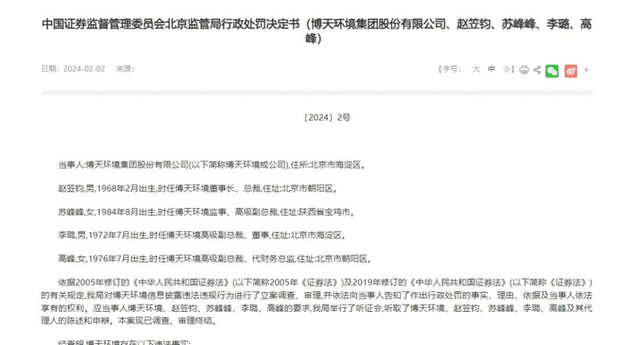 2月2日,据中国证监会北京监管局网站消息,北京证监局指出,经查明博天环境存在以下违法事实: