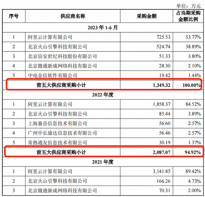 其中,阿里云计算有限公司(以下简称“阿里云”)是易诚互动的第一大供应商,报告期内,公司向阿里云的采购金额分别为2376.91万元、3141.85万元、1858.37万元、725.53万元,占当期采购比例分别为86.02%、89.42%、84.52%和53.77%。