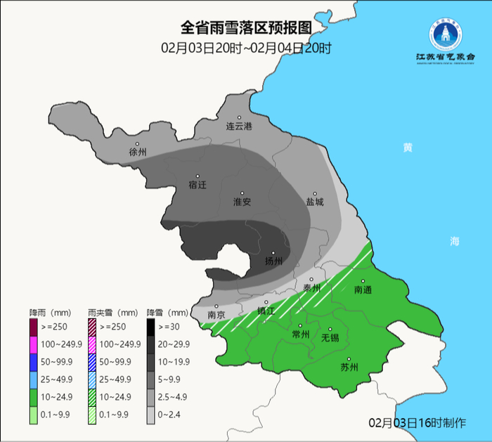 江苏省气象台2024年02月03日15时升级发布暴雪黄色预警:预计今天夜里到明天,南京、淮安、徐州、宿迁、扬州、泰州、盐城、连云港有大雪,其中南京中北部、宿迁南部、淮安、扬州、泰州北部、盐城、连云港南部等地的部分地区有暴雪,局地有大暴雪,积雪深度可达5-10厘米。