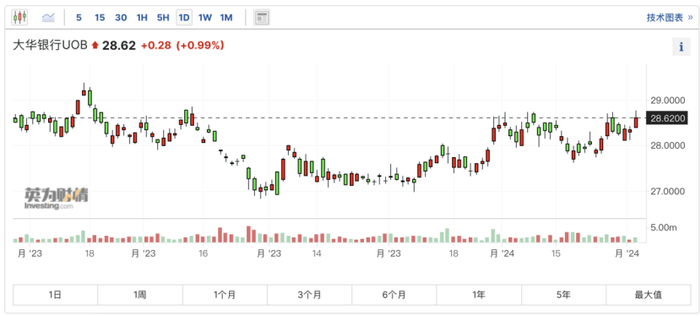 截至最新收盘,大华银行的总市值约为478.7亿新元(约合人民币2600亿元)。据财报显示,截至2023年上半年,大华银行的资产规模高达5055.6亿新元(约合人民币27000亿元)。