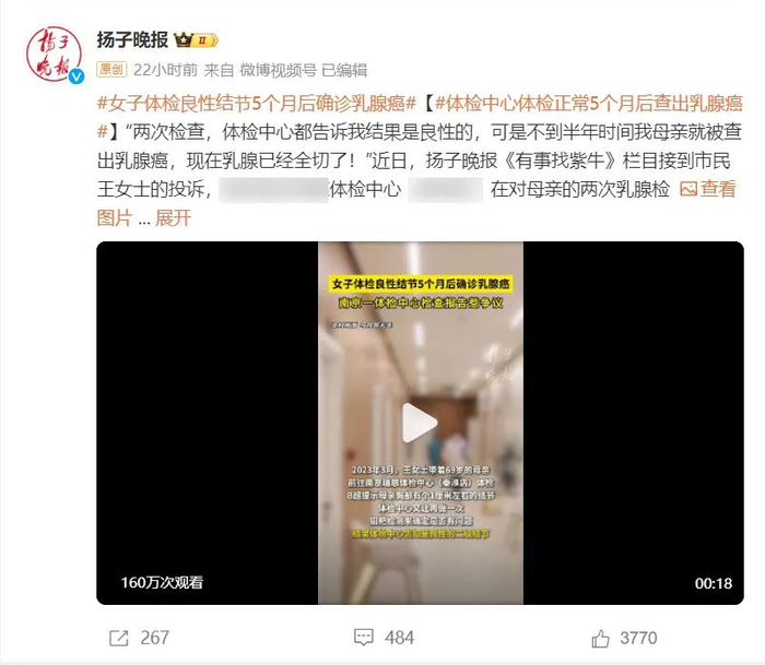 “两次检查,体检中心都告诉我结果是良性的,可是不到半年时间就出了乳腺癌,现在乳腺已经全切了!”2月3日“体检中心体检正常5个月后查出乳腺癌”登上热门话题,受很多人关注。