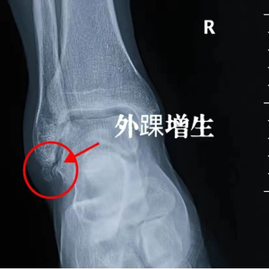 经过查体我们进行了x线检查,他的外踝有明确的骨质增生,关节间隙发生了狭窄。在侧位上谢医生做了红色的圆圈标记,这是一个非常严重的增生,仿佛在胫骨的远端长出了一个菜花,那这个增生的部位就会导致患者出现蹲起时踝关节的疼痛,它不可能是几年的时间形成的,需要的时间很漫长。