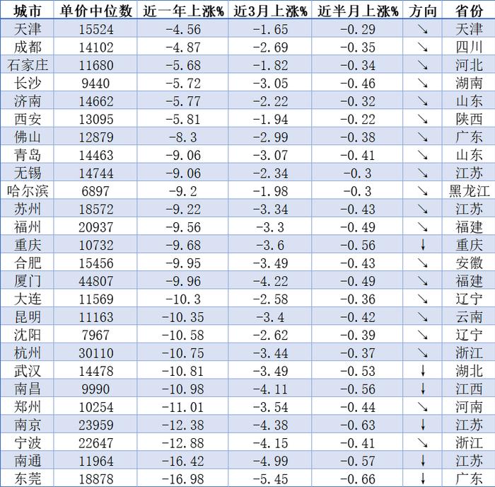 过去一年,曾经领涨全国的东莞,如今领跌,累计跌幅16.98%。此外,南通、宁波、南京、郑州、南昌、武汉、杭州、沈阳、昆明、大连,跌幅都在两位数。