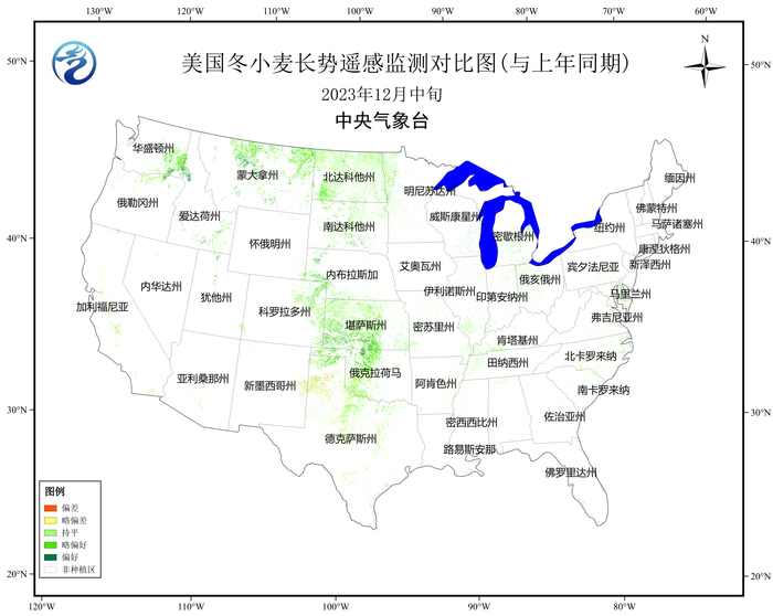 2023年12月卫星遥感监测结果显示,与上年同期相比,美国冬小麦长势持平比例为48%,略偏好比例为45%,略偏差比例为7%(图11),总体长势较上年同期偏