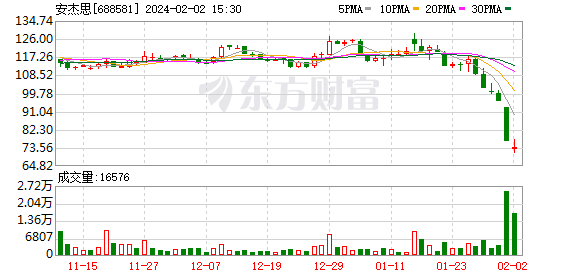 2月1日,安杰思股价出现大幅波动,盘中快速跳水并跌停,股价创上市以来新低。翌日,股价再跌4.24%,截至收盘报价73.55元。