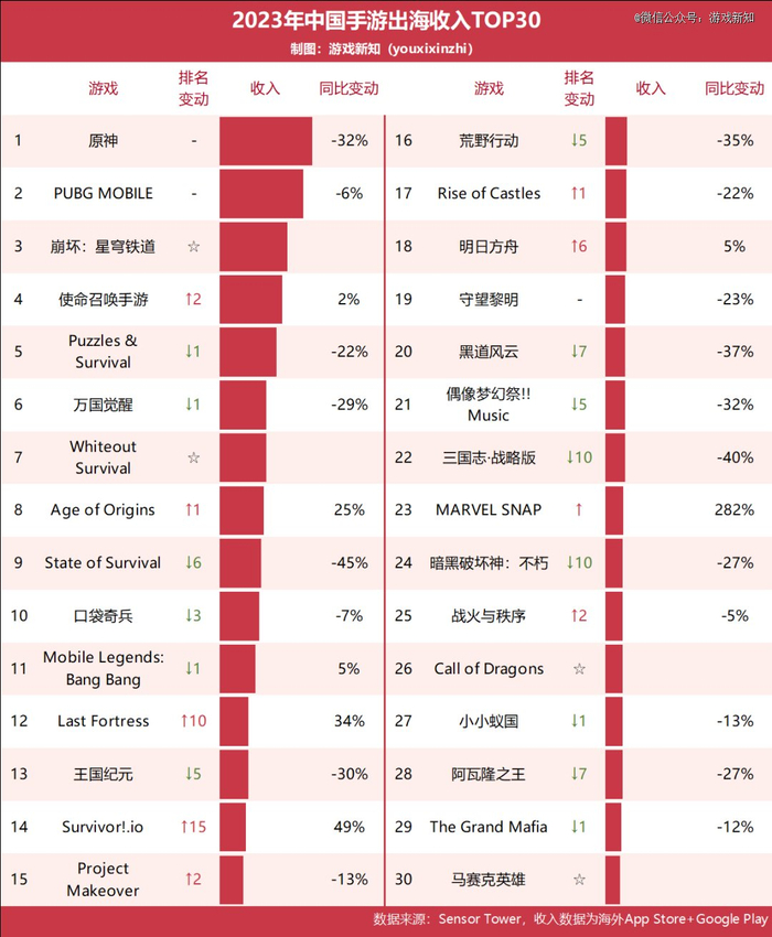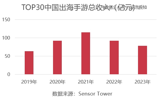 《2023年中国游戏出海研究报告(下文简称为2023年出海报告)》显示,中国自研游戏在海外市场的实际销售收入为163.66亿美元,同比下降5.65%,下滑比率较2022年的-3.7%进一步扩大。出海压力变大,连头部产品也很难幸免。Sensor Tower的数据显示,TOP30中国出海手游的总收入为78亿美元,同样连续两年出现下滑。