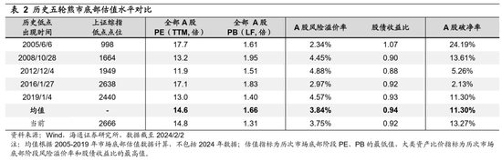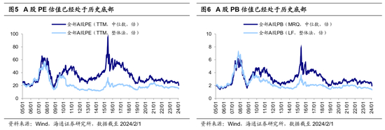 A股市场估值已处在历史底部,市场情绪低迷。从估值来看,A股PE/PB估值水平与历史大底时已经较为接近。整体法视角下,目前(截至2024/2/2,下同)全部A股PE(TTM,下同)为14.8倍、处05年以来从低到高19.2%分位;全部A股PB(LF,下同)为1.31倍、处05年以来最低分位水平。中位数视角下,当前全部A股PE中位数为19.4倍、处05年以来1.5%分位,PB中位数为1.84倍、处05年以来5.9%分位。