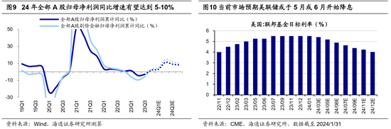 积极的宏观政策发力有望催化行情转暖。正如我们前文所述,当前A股估值、破净率、风险溢价等指标显示市场已处在大的底部区域,融资及股权质押的压力还需继续观察,不过积极政策的密集出台有望使得宏微观基本面逐渐转暖,资金面后续也有望出现积极变化。今年年初以来一系列积极政策密集出台,从宏观金融政策到资本市场,再到地产、地方化债、区域和产业政策等。本周政策仍在持续落地中。央行1月继续投放抵押补充贷款1500亿元支持三大工程建设;广州、石家庄等城市也官宣落地首批城中村改造专项借款;上海、苏州等城市继续优化楼市限购政策,以更好满足居民合理住房需求。政策加持下宏微观基本面或逐渐修复,24年1月制造业PMI回升0.2个百分点至49.2%,涨幅强于季节性。海外方面,美联储1月议息会议维持利率水平不变,此次议息会议的声明中删除了进一步收紧的表述,意味着今年美联储降息是大概率事件。当前市场预计美联储可能在5月或6月开始降息,随着未来美联储进入降息周期,美国长债利率大概率还要震荡回落,叠加近期中美关系进一步缓和,外资也有望出现积极动向。
