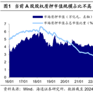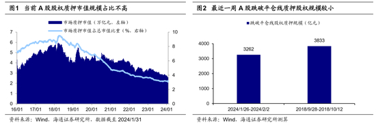 投资者担忧1:股权质押有爆仓压力吗?目前(截至2024/1/31)A股市场质押股权市值规模为2.6万亿元,占A股总市值的3.2%,而在2018年10月时质押股权市值规模超过4万亿元,占总市值比重超过8%,相较而言当前A股股权质押规模比例不高。不过如果股价较快下跌导致触及平仓线,股权质押的出质方将抛售股票补充保证金,会可能会加剧市场下跌,进一步冲击流动性,因此我们将继续分析股权质押引发负反馈的风险。