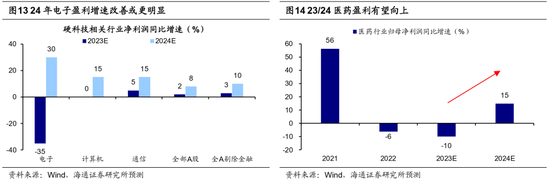 中期白马成长或将占优,具体重视两方面:一方面,以电子为代表的硬科技制造。我们认为要重视以下三个领域:一是半导体周期回升背景下的电子;二是或受益于财政发力的数字基建和数据要素;三是政策支持和技术突破下的AI应用。另一方面是医药。目前医药生物板块的估值和基金配置仍处于较低水平。往后看,医疗反腐对行业的影响逐渐过去,并且中期来看我国人口老龄化正在加深,医疗需求将持续增加,未来一段时间医药的估值及公募基金等机构的持仓有望趋于均衡,结合行业分析师预测,可以关注创新药/血制品/高值耗材,24年归母净利有望分别达到30%/15%/15%。