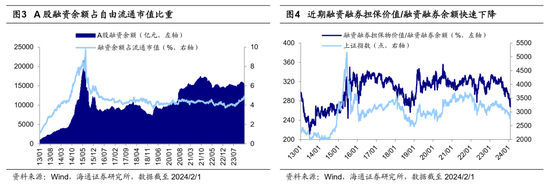 投资者担忧2:杠杆资金压力大吗?从融资余额占比看,目前(截至2024/2/1,下同)A融资余额占自由流通市值比重为4.9%,低于15年6月时的9%,但高于18年10月的4.6%。从融资交易占比看,目前融资买入额占A股成交额的比重为6.5%,低于15年6月时的11%左右、18年10月时的8%左右。考虑到近年来两融标的进行过多次扩容,我们分别以15年6月(口径1)、18年10月(口径2)的两融标的为口径、来计算当前A股融资余额的占比:①口径1下,当前融资余额占其自由流通市值的比重为4.7%,低于15/6/19时的12.6%。②口径2下,当前融资余额占其自由流通市值的比重为4.7%,低于18/10/19时的5.7%。综合来看,目前A股融资余额和交易占市场比重相对较低。