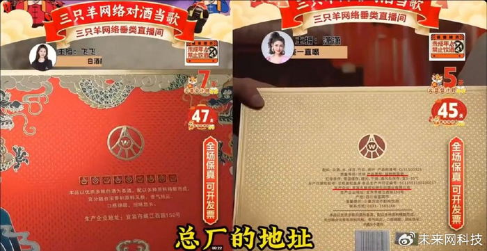夏勇进一步向记者介绍,而像这些号称总厂地址岷江西路150号(五粮液公司地址)的产品,无非是借用“五粮液”这块金字招牌进行宣传销售。这类产品都不是五粮液公司的“嫡系”产品,因为“嫡系酒”的定价权由五粮液公司决定,利润空间有限。上述直播间所销售的都是“贴牌酒”,只在线上销售,利润空间更大。主播直接拿“五粮液”做噱头来宣传的行为,明显侵犯“五粮液”的商标权,这些产品应该叫“国杯”“金珀”,主播需要把各自品牌厂家的溯源介绍清楚。