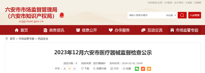 2023年12月安徽省六安市医疗器械监督检查公示