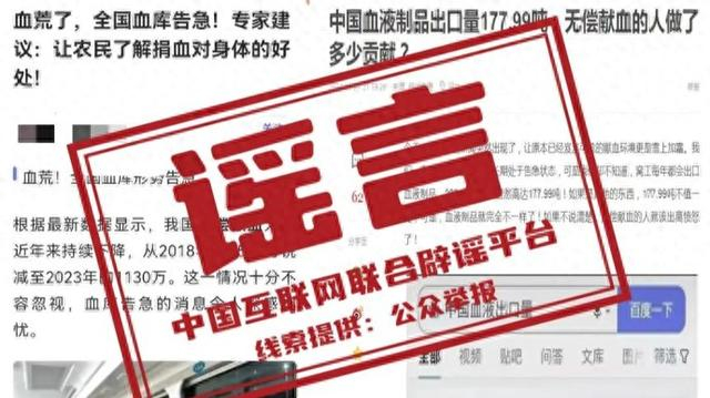近日,有少数网络自媒体发文称,根据国家卫健委的数据,我国无偿献血人数从2018年的1520万下降到2023年的1130万,远低于世界卫生组织推荐的1.8%。还有自媒体发文称,中国是血液制品出口大国,据海关总署统计显示,2021年中国血液制品出口数量达到177.99吨,而177.99吨的血液制品就需要889.95吨的新鲜血液,质疑其中“无偿献血的人做了多少贡献 ?”对此,中国互联网联合辟谣平台向有关主管部门核实查证,证实上述自媒体发布的涉无偿献血不实信息,故意抹黑无偿献血政策,影响血液采集正常秩序,引发公众对无偿献血的误解。