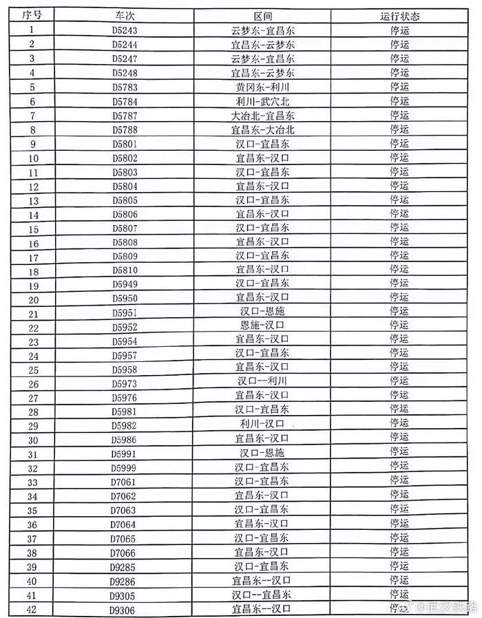 此前2月3日21时,@武汉铁路 公布宜昌东站2月4日临时停运列车信息(见附表)。