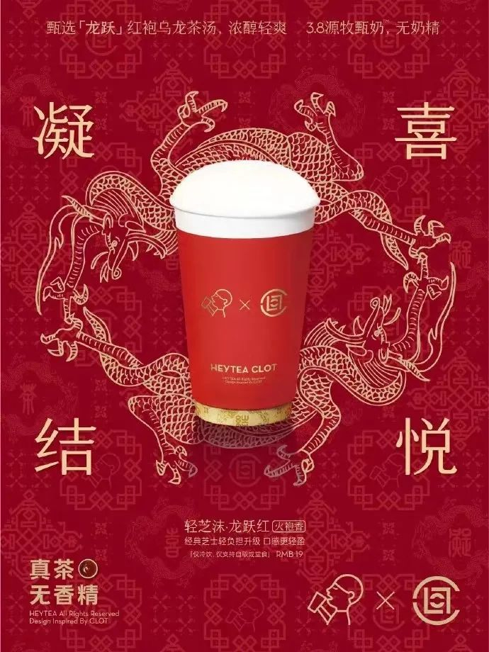 潮牌CLOT与TOMMY HILFIGER联手发售了龙年卫衣、夹克等各类单品,被买到断货。其与喜茶联名,以东方代表元素“龙图腾”&“红丝绸”为灵感,推出龙年春节联名产品及周边,其中的“喜悦凝结”限定茶碗也火到要代购。