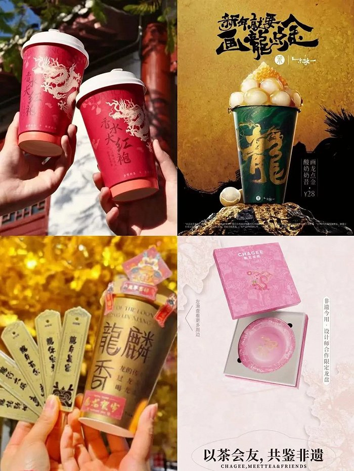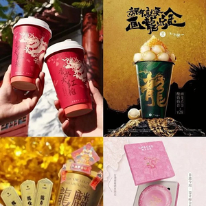 奈雪联合《故宫纹样》推出“香水大红袍”新春联名系列,以“升龙纹”“如意云纹”为核心元素;甜啦啦推出龙麟香鲜奶茶,杯身呈金黄色并附有龙的暗纹,8天销量突破230万杯;茉酸奶饮品杯上的“龙”字是由书法家朱敬一提笔完成;霸王茶姬致敬非遗传统“烟花火龙”,打造“非遗今用”系列限定周边;瑞幸特别邀请福娃之父韩美林操刀,在彩色格子中嵌入了“新年瑞幸”、“吉庆有余”的等字样图案,极具艺术气息……