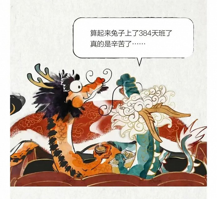 相比兔年的384年,龙年只有354天,茶颜悦色围绕这一主题在公众号发布了一条长图内容,运用水彩漫画与自对话的呈现方式,设计了一条“打工龙”的角色,讨论起了龙年究竟打多少天工的问题,很难不令社畜们共情,阅读量直接刷到10w+。