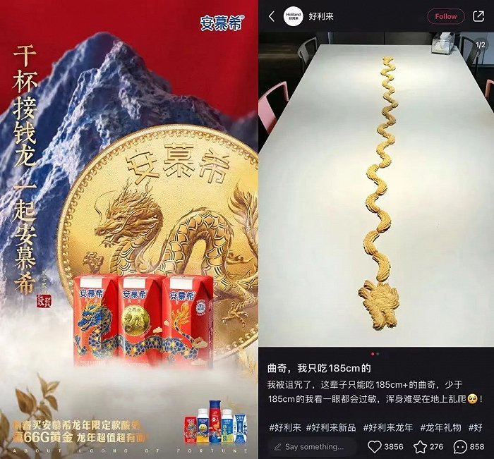 安慕希玩了把“钱钱钱钱钱钱钱钱钱钱龙来了”的梗,瓶身相接可以组成一条“钱龙”,带有聚拢财气之意,甚至购买安限定产品有机会赢得66克真黄金;好利来推出好运长龙芝士酥,在小红书上玩了一把“185cm”的段子。