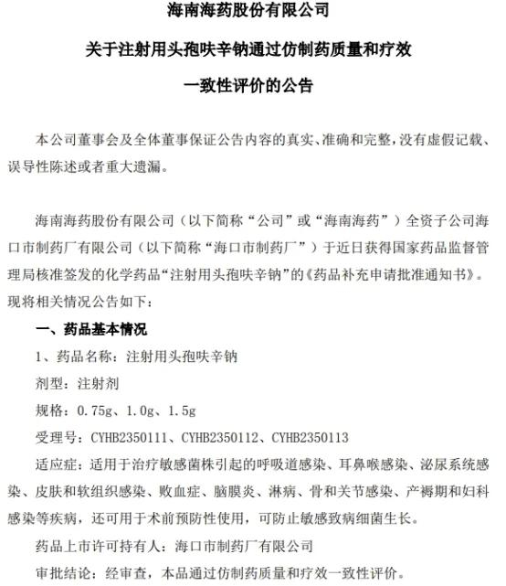 海南海药表示,本次注射用头孢呋辛钠通过一致性评价,将有利于提升该药品的市场竞争力,对公司业绩产生积极的影响。