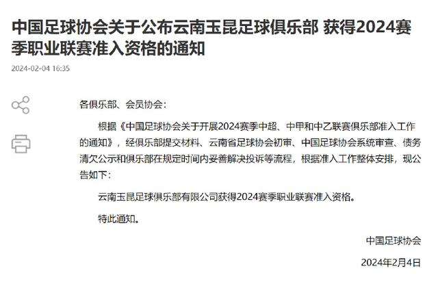2月4日下午,中国足协通过官方渠道宣布,中乙联赛俱乐部云南玉昆俱乐部正式获得2024赛季职业联赛准入资格。北京青年报记者获悉,玉昆俱乐部是在相继通过中国足协审查、债务清欠公示,并在规定时间内妥善解决被投诉问题后,最终获得新赛季职业联赛准入资格的。俱乐部按照相关规定,将提交有关递补参加新赛季中甲联赛的申请。