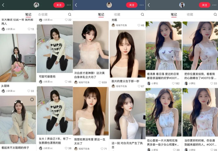 除了可以从照片本身判断,AI账号的行为也值得琢磨。为了涨粉,有的账号会一天之内发送好几条不同妆造的图文,殊不知这也成为了它们的最大破绽——如此劳模,必然不是人类。