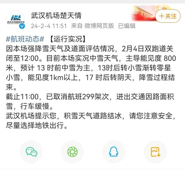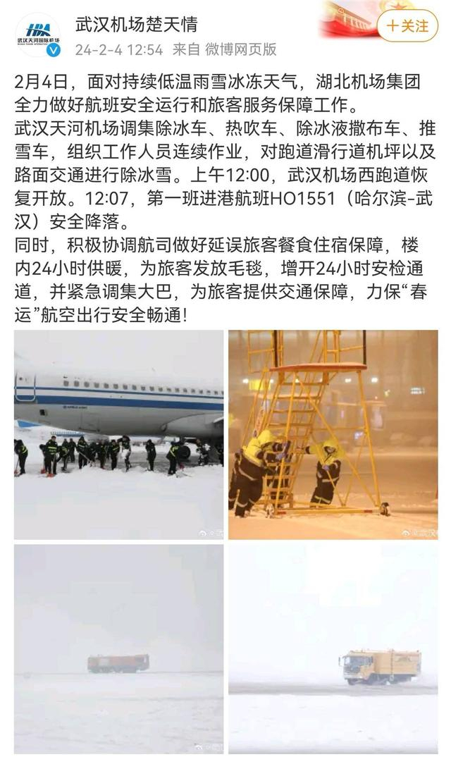 2月4日,武汉机场官方发布消息称,因本场强降雪天气及道面评估情况,2月4日双跑道关闭至12:00。截至10:00,已取消航班278架次。12:00,武汉机场西跑道恢复开放。12:07,第一班进港航班HO1551(哈尔滨-武汉)安全降落。