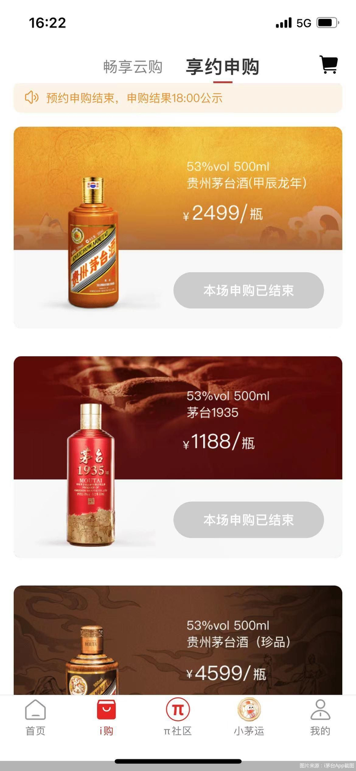 2022年3月31日,i茅台App正式上线,其中仅53度500ml贵州茅台酒(壬寅虎年) 、 53度500ml茅台1935、53度375ml×2(壬寅虎年)、53度500ml贵州茅台酒(珍品)4款产品参与申购。