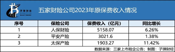 财险业务方面,“老三家”人保财险、平安产险、太保产险2023年合计实现原保费收入1.01万亿元,同比增长5.66%。但从增速方面来看,未能延续去年高歌猛进势头。