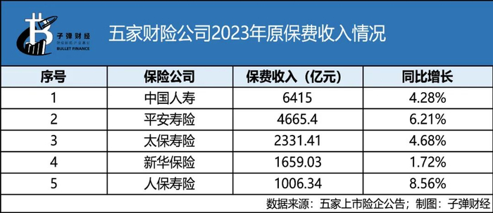 其中,中国人寿、中国人保、中国平安、新华保险及中国太保在2023年分别实现保费收入为6415亿元、6616.49亿元、8006.95亿元、1659.03亿元及4234.68亿元。